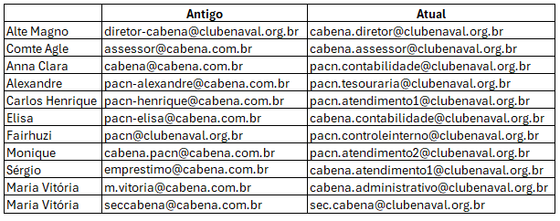 Informamos que realizamos a atualização dos nossos endereços de e-mail institucionais, os contatos anteriormente utilizados foram substituídos. Para garantir a continuidade e agilidade na comunicação, solicitamos que passem a utilizar exclusivamente os novos e-mails, conforme tabela abaixo: